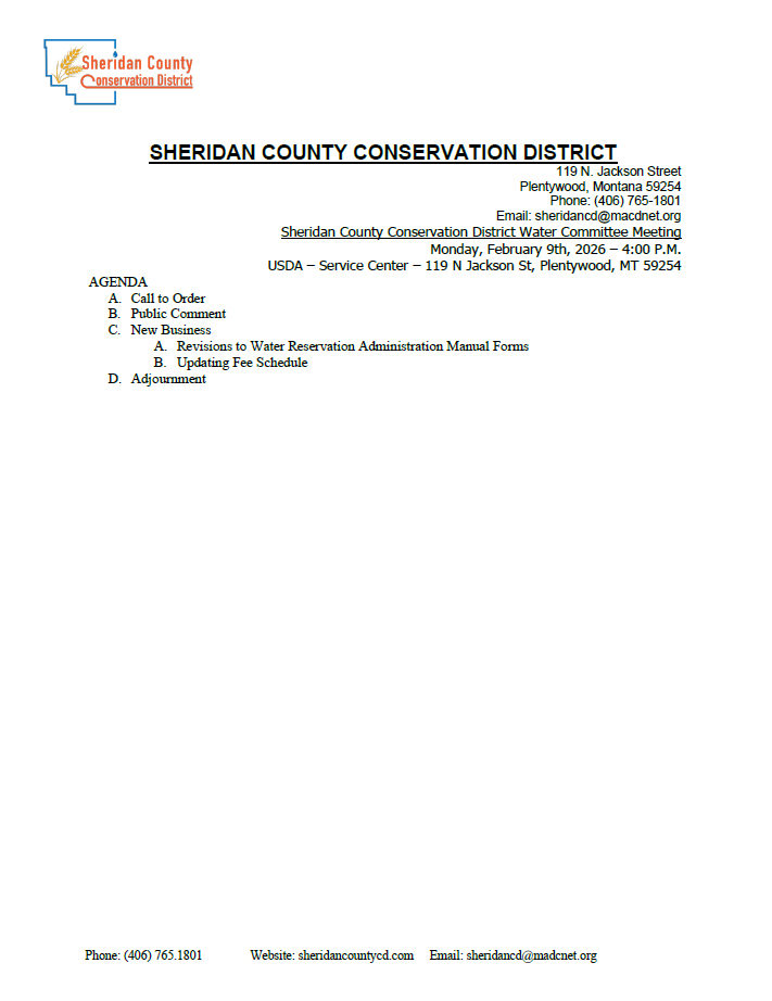 The Sheridan County Conservation District will hold a special Water Committee Meeting on Monday, February 9th, 2026 at 4:00 PM at the USDA Service Center in Plentywood, MT. Draft Agenda is below.