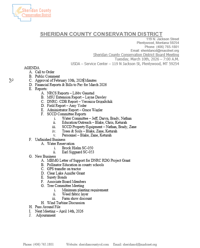 The Sheridan County Conservation District will hold their monthly board meeting on Tuesday, March 10th, 2026 at 7:00 AM at the USDA Service Center in Plentywood, MT. Draft Agenda is below.